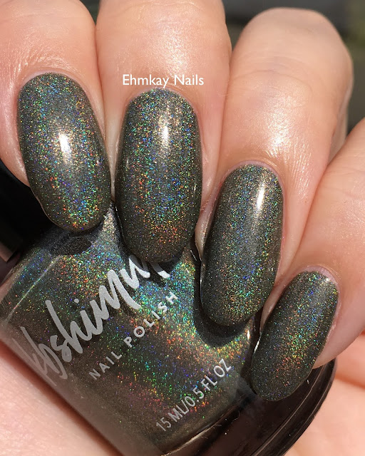 Fully Booked: 2 coats but almost a one coater. "Fully Booked is a nod to those classically colored novels of days gone by. This rich olive-green hue is loaded with linear holo pigment." I definitely have some old leather bound books that have aged to this color. This is a chameleon. Sometimes it looks grey and other times green. I love the color and its uniqueness.