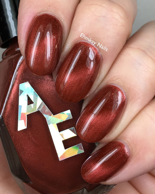 The shimmer shows off the dimension of the polish. In the sun, you can almost see a deep coppery color because of the magnet. It has a little bit of brown undertones. This makes it a wearable red for me! I do not really love wearing bright reds. I actually planned to do art on this, but left it alone because it was so pretty.