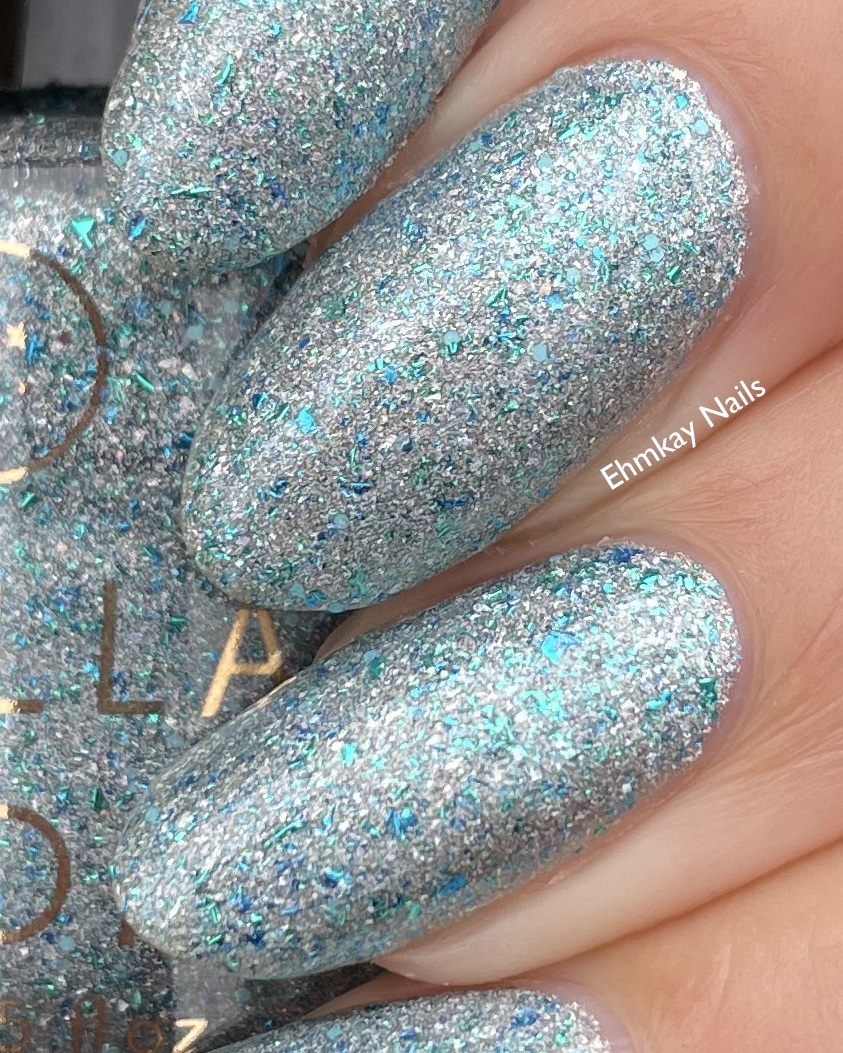“We chose the moon as our inspiration for this month! Waxing and Waning is a shining silver holographic polish with metallic blue and turquoise flakies.”